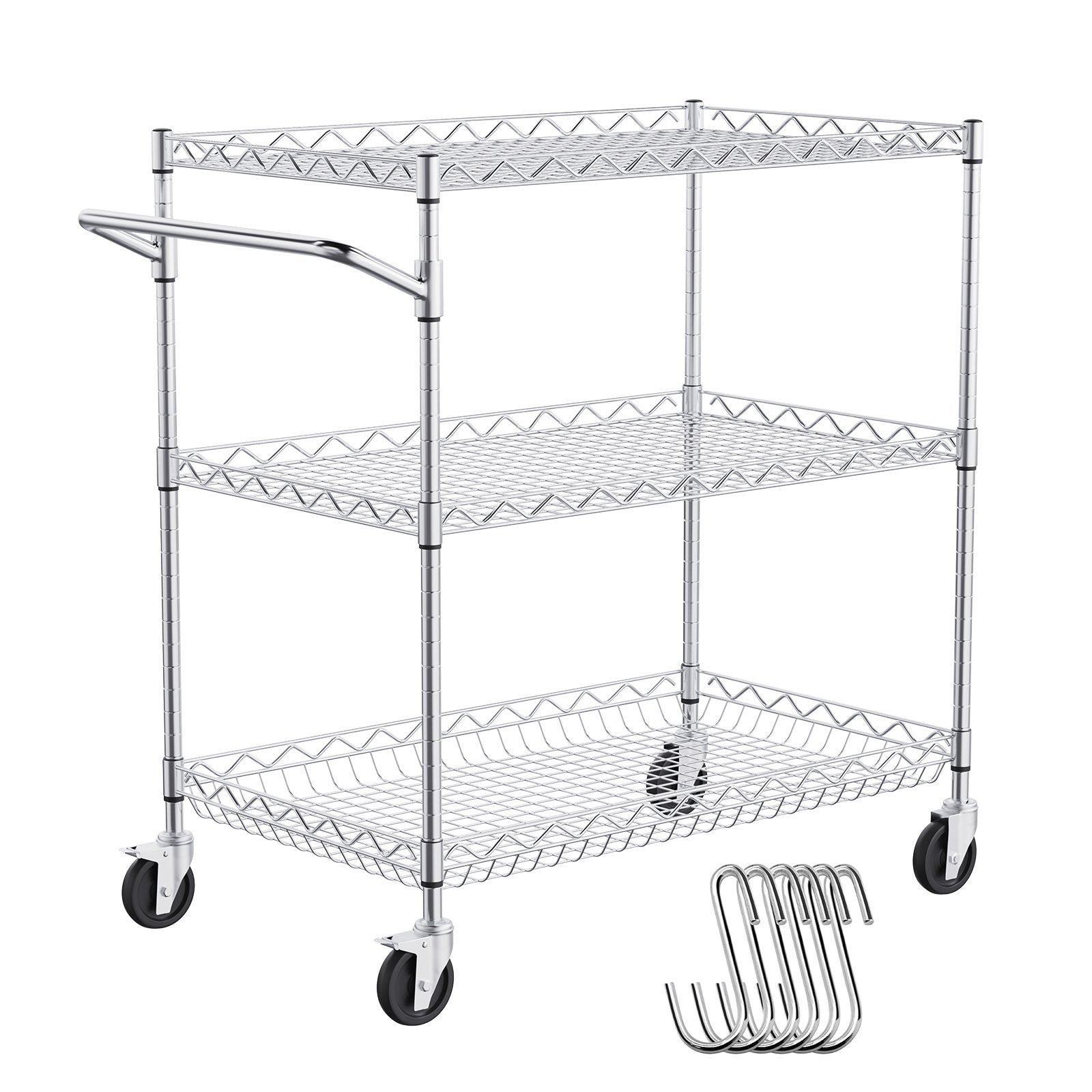 VEVOR Kitchen Utility Cart, 3 Tiers, Wire Rolling Cart with 300kg Capacity, Steel Service Cart on Wheels, Metal Storage Trolley with 80mm Deep Basket Curved Handle 6 Hooks, for Indoor and Outdoor Use