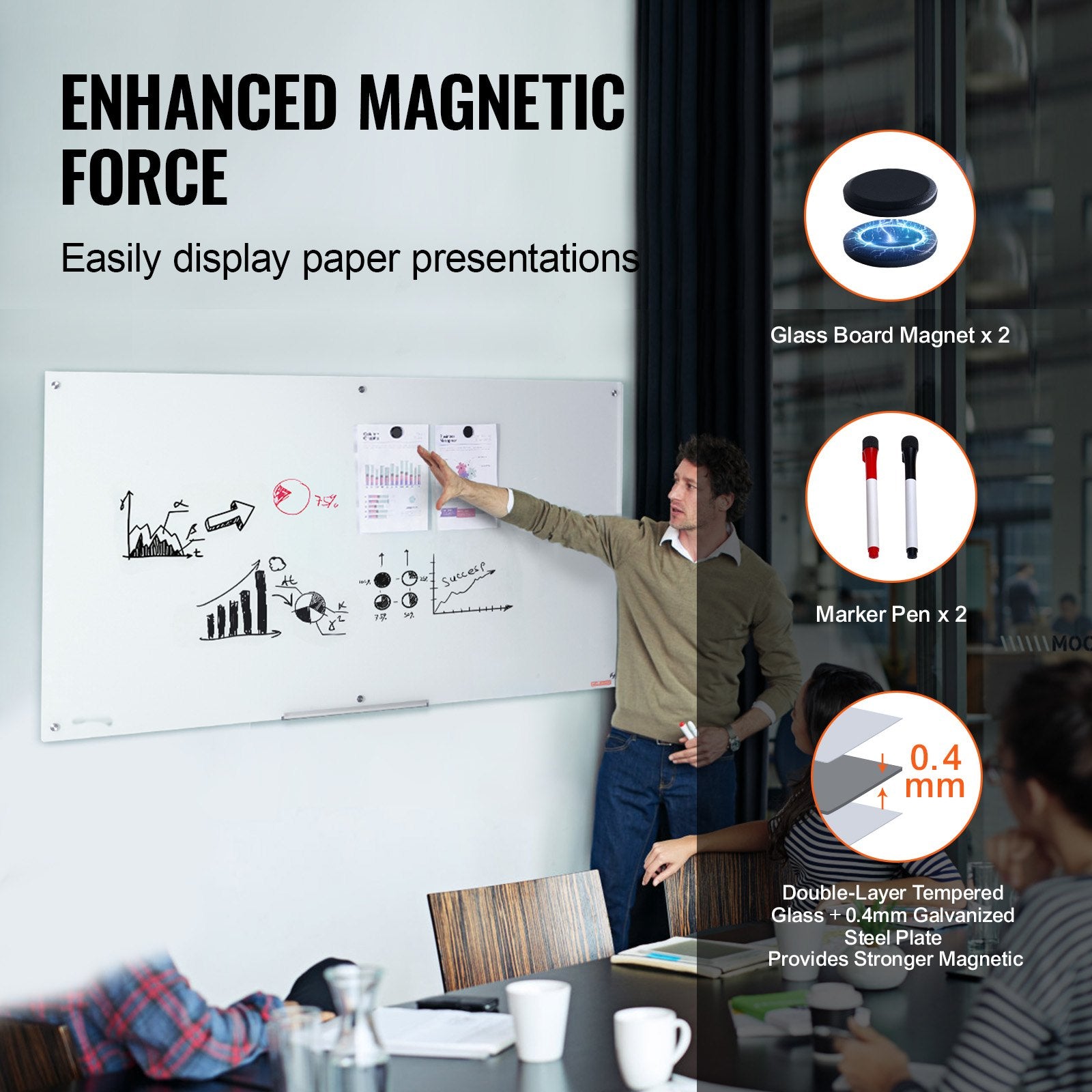 VEVOR Magnetic Glass Whiteboard, Dry Erase Board 72"x36", Wall-Mounted Large White Glassboard Frameless, with Marker Tray, an Eraser and 2 Markers, White