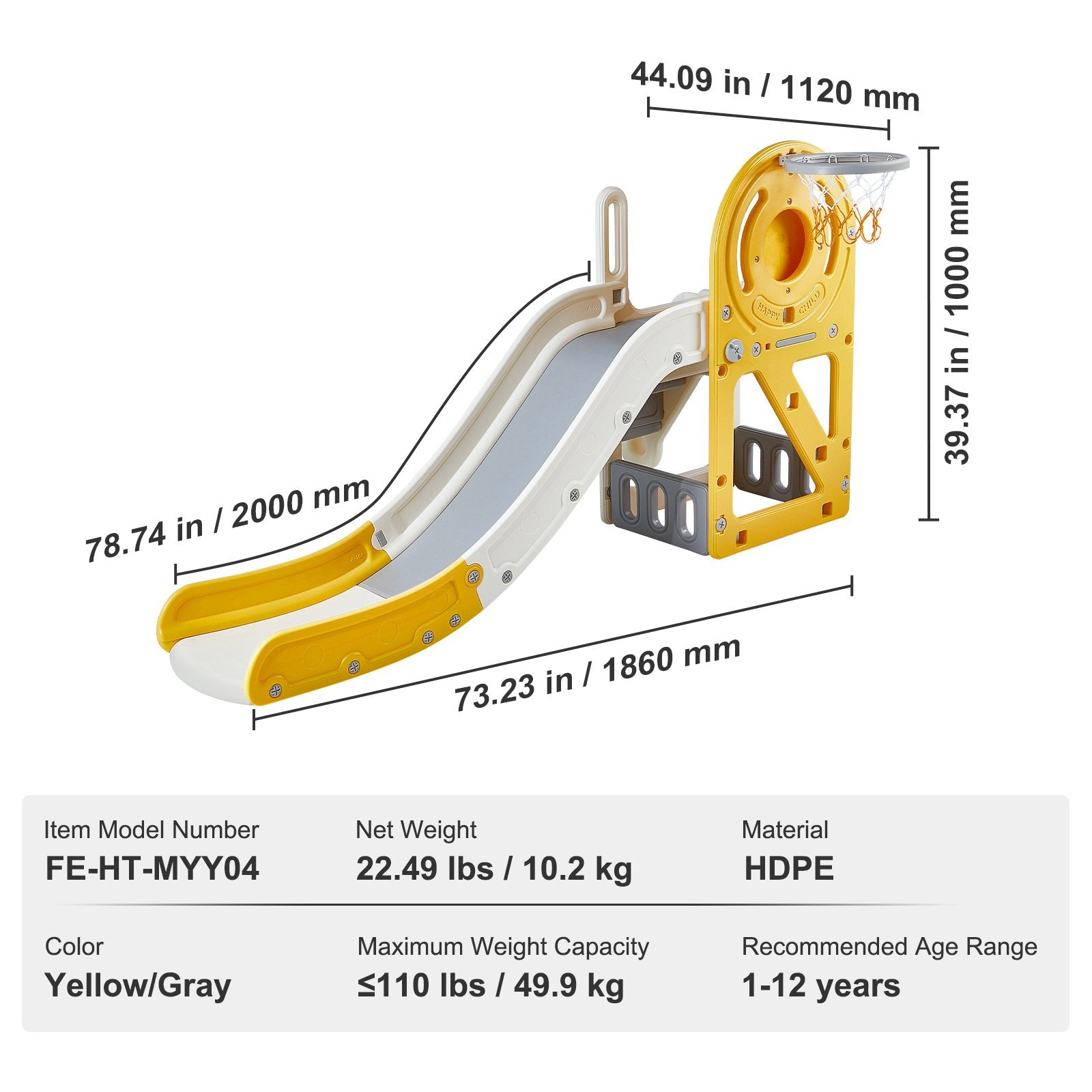 Colors: Yellow/Gray,Slide Length: 6.56 ft / 200 cm,Item Model Number: FE-HT-MYY04,Item Dimensions: 73.23 x 44.09 x 39.37 in / 1860 x 1120 x 1000 mm,Material: HDPE,Maximum Weight Capacity: ≤110 lbs / 49.9 kg,Recommended Age Range: 1-12 years,Net Weight: 22.49 lbs / 10.2 kg