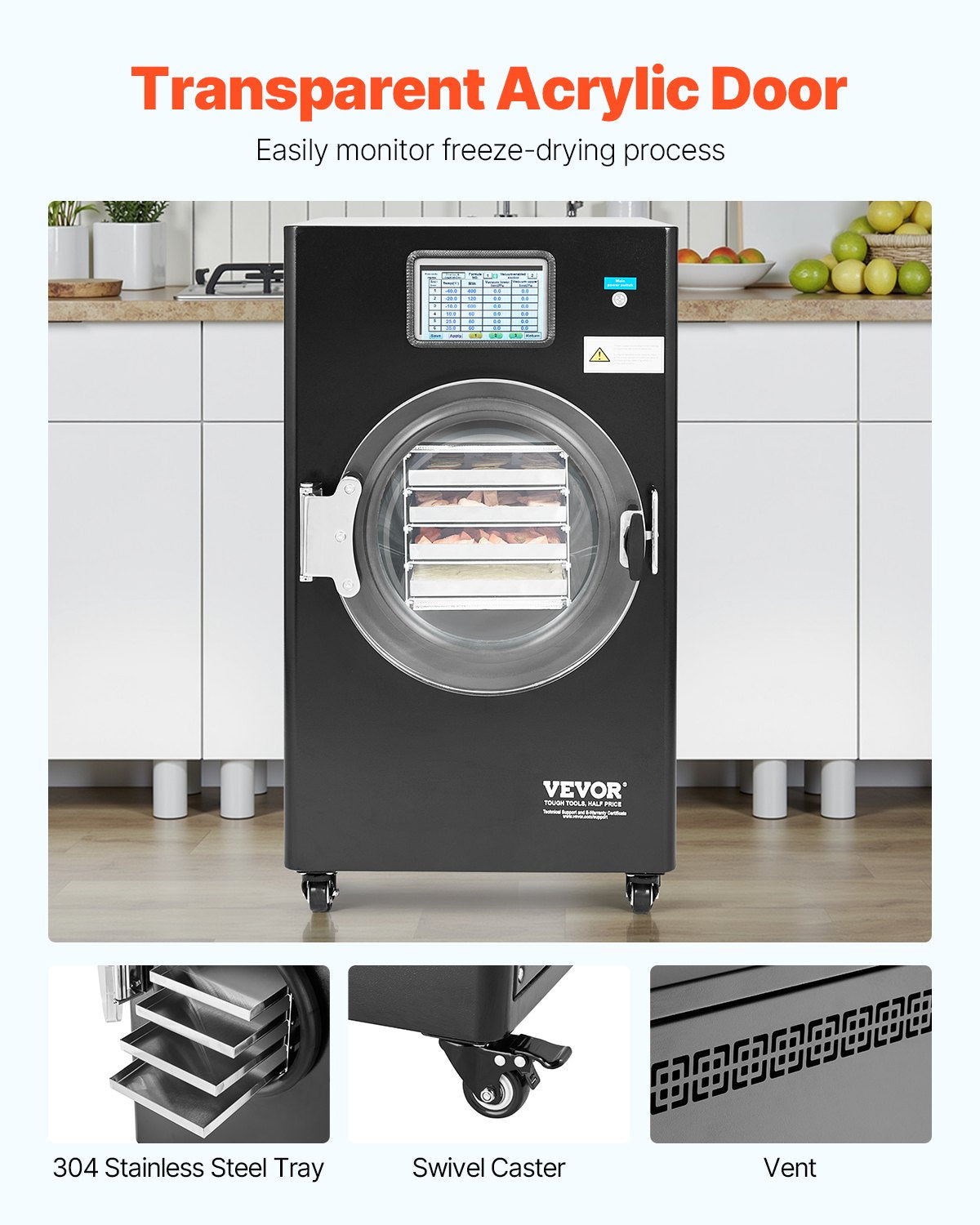 - Visualized Freeze-Drying Process: The high-transparency acrylic door allows you to closely monitor the entire freeze-drying process. The 304 stainless steel trays are durable and reliable, ensuring peace of mind. The design also includes swivel casters for easy mobility