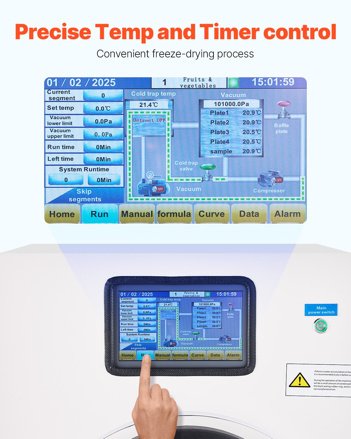 - Intelligent Control: The freeze dryer machine is equipped with an easy-to-use touch screen control system, making operation simple yet powerful. It offers programmable temperature control, freeze-drying curves, and process observation, ensuring precise and customized freeze-drying results for various applications