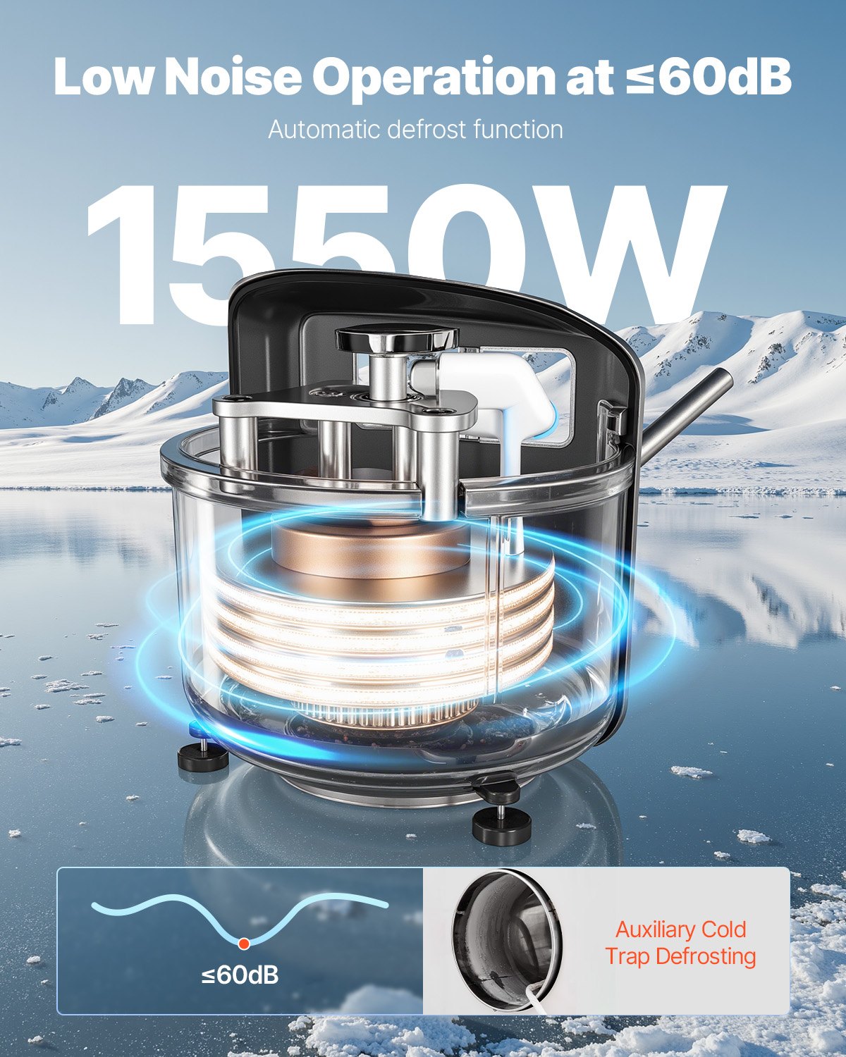 - Efficient Freeze Drying: Thanks to the powerful compressor, the freeze drying machine cools quickly. The -35°C cold trap temperature ensures effective water removal during the freeze-drying process. Paired with a strong vacuum pump, it maintains optimal vacuum conditions and prevents compatibility issues with the vacuum pump