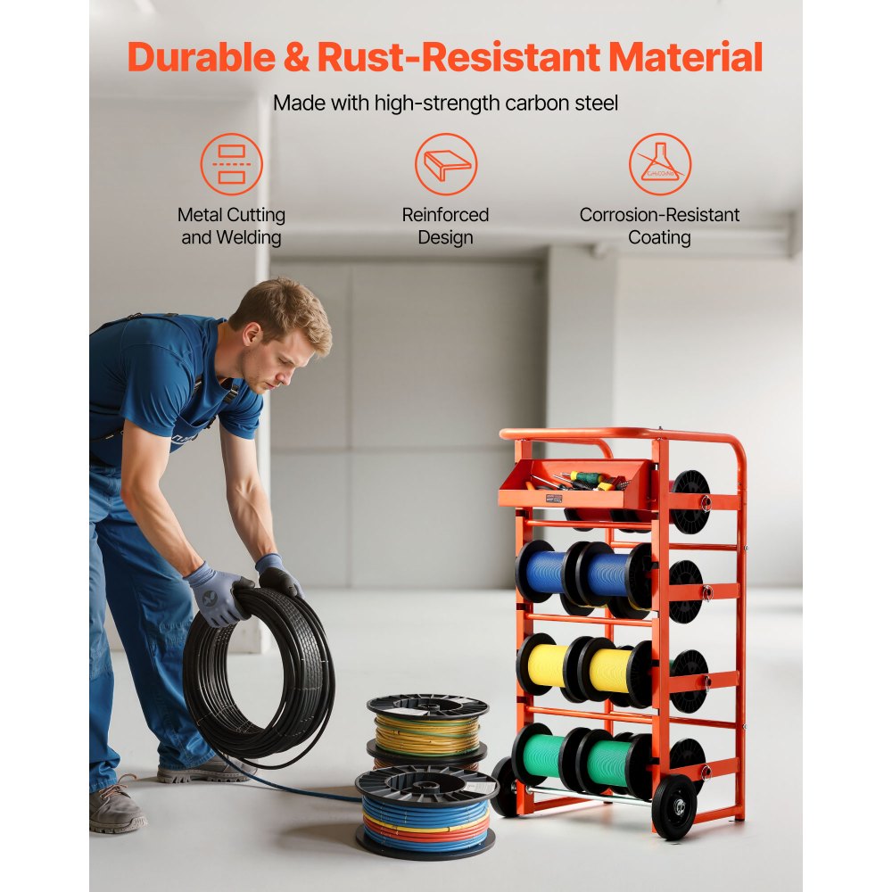 - Dual Wheel, Easy Movement: Equipped with 2 solid rubber wheels at the bottom, our wire spool cart is easy to move anywhere. It allows for effortless transportation of cables and wires between workstations, garages, and job sites